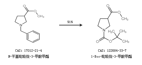 1.通过N-苄基吡咯烷-3-甲酸甲酯合成1-Boc-吡咯烷-3-甲酸甲酯,收率约91%;