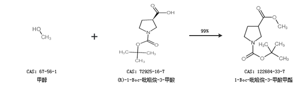 2.通过甲醇和(R)-1-Boc-吡咯烷-3-甲酸合成1-Boc-吡咯烷-3-甲酸甲酯,收率约99%;
