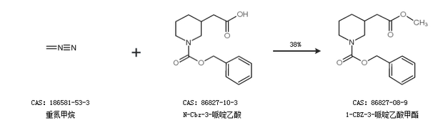 1.通过重氮甲烷和N-Cbz-3-哌啶乙酸合成1-CBZ-3-哌啶乙酸甲酯,收率约38%;