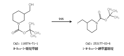 1.通过N-Boc-3-哌啶甲醇合成1-N-Boc-3-碘甲基哌啶,收率约94%;