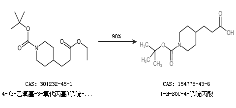 2.通过4-(3-乙氧基-3-氧代丙基)哌啶-1-羧酸叔丁酯合成1-N-BOC-4-哌啶丙酸,收率约90%;