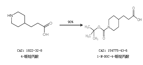 1.通过4-哌啶丙酸合成1-N-BOC-4-哌啶丙酸,收率约90%;
