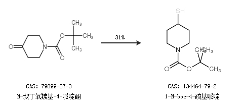 1.通过N-叔丁氧羰基-4-哌啶酮合成1-N-boc-4-疏基哌啶,收率约31%;