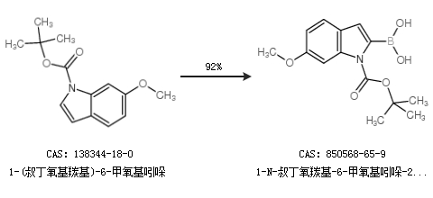 1.通过1-(叔丁氧基羰基)-6-甲氧基吲哚合成1-N-叔丁氧羰基-6-甲氧基吲哚-2-硼酸,收率约92%;