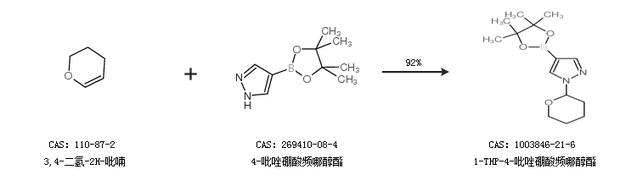 1.通过3,4-二氢-2H-吡喃和4-吡唑硼酸频哪醇酯合成1-THP-4-吡唑硼酸频哪醇酯,收率约92%;