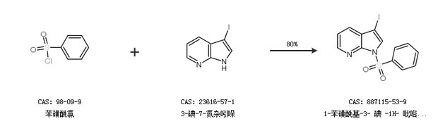 1.通过苯磺酰氯和3-碘-7-氮杂吲哚合成1-苯磺酰基-3- 碘 -1H- 吡咯[2,3-B]吡啶,收率约80%;