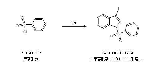 2.通过苯磺酰氯合成1-苯磺酰基-3- 碘 -1H- 吡咯[2,3-B]吡啶,收率约62%;