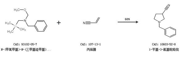 1.通过N-(甲氧甲基)-N-(三甲基硅甲基)苄胺和丙烯腈合成1-苄基-3-氰基吡咯烷,收率约68%;