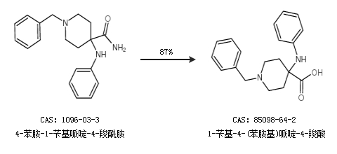 1.通过4-苯胺-1-苄基哌啶-4-羧酰胺合成1-苄基-4-(苯胺基)哌啶-4-羧酸,收率约87%;