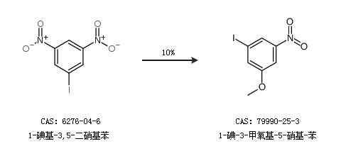 2.通过1-碘基-3,5-二硝基苯合成1-碘-3-甲氧基-5-硝基-苯,收率约10%;