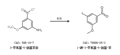 1.通过3-甲氧基-5-硝基苯胺合成1-碘-3-甲氧基-5-硝基-苯,收率约81%;