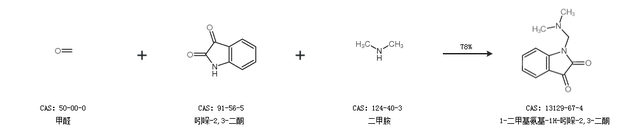 1.通过甲醛、吲哚-2,3-二酮和二甲胺合成1-二甲基氨基-1H-吲哚-2,3-二酮,收率约78%;