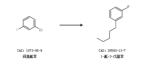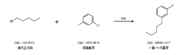 1.通过溴代正戊烷和间溴氟苯合成1-氟-3-戊基苯,收率约93%;