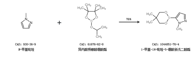 1.通过N-甲基吡唑和异丙醇频哪醇硼酸酯合成1-甲基-1H-吡唑-5-硼酸新戊二醇酯,收率约76%;