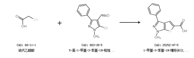 1.通过硫代乙醇酸和5-氯-1-甲基-3-苯基-1H-吡唑-4-甲醛合成1-甲基-3-苯基-1H-噻吩并[2,3-c]吡唑-5-羧酸