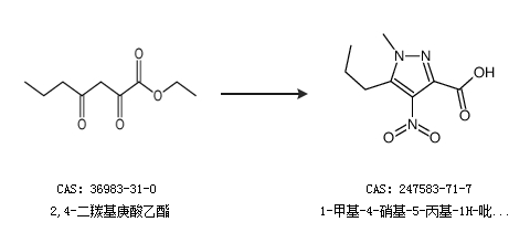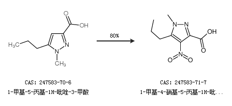1.通过1-甲基-5-丙基-1H-吡唑-3-甲酸合成1-甲基-4-硝基-5-丙基-1H-吡唑-3-羧酸,收率约80%;