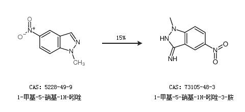 1.通过1-甲基-5-硝基-1H-吲唑合成1-甲基-5-硝基-1H-吲唑-3-胺,收率约15%;