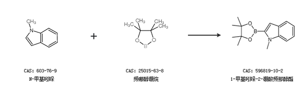 1.通过N-甲基吲哚和频哪醇硼烷合成1-甲基吲哚-2-硼酸频那醇酯,收率约45%;