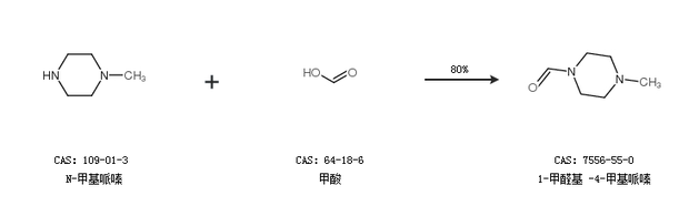 1.通过N-甲基哌嗪和甲酸合成1-甲醛基 -4-甲基哌嗪,收率约80%;