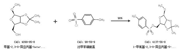 1.通过甲基-2,3-O-异亚丙基-beta-D-呋喃核糖苷和对甲苯磺酰氯合成1-甲氧基-2,3-O-异亚丙基-5-O-对甲苯磺酰基-beta-D-呋喃核糖苷,收率约98%;