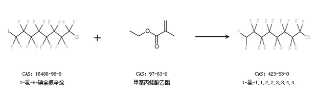 1.通过1-氯-8-碘全氟辛烷和甲基丙烯酸乙酯合成1-氯-1,1,2,2,3,3,4,4,5,5,6,6,7,7,8,8-十六氟辛烷
