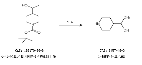 2.通过4-(1-羟基乙基)哌啶-1-羧酸叔丁酯合成1-哌啶-4-基乙醇,收率约91%;