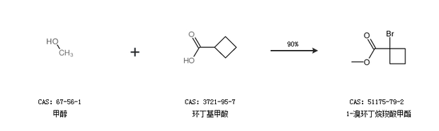 1.通过甲醇和环丁基甲酸合成1-溴环丁烷羧酸甲酯,收率约90%;