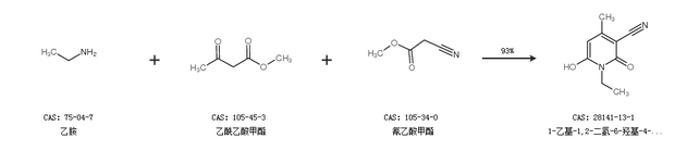2.通过乙酰乙酸乙酯、乙胺和氰乙酸乙酯合成1-乙基-1,2-二氢-6-羟基-4-甲基-2-氧代-3-吡啶氰,收率约92%;