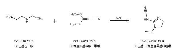 1.通过N-乙基乙二胺和N-氰亚胺基碳酸二甲酯合成1-乙基-2-氰基亚氨基咪唑啉,收率约50%;