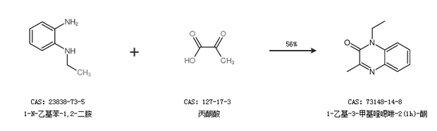 1.通过1-N-乙基苯-1,2-二胺和丙酮酸合成1-乙基-3-甲基喹噁啉-2(1h)-酮,收率约56%;