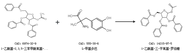 1.通过1-乙酰基-2,3,5-三苯甲酰氧基-1-beta-D-呋喃核糖和L-甲基多巴合成1-乙酰基-三-苄氧基-罗伯糖