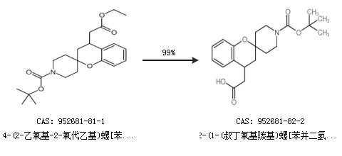 2.通过4-(2-乙氧基-2-氧代乙基)螺[苯并二氢吡喃-2,4-哌啶]-1-羧酸叔丁酯合成2-(1-(叔丁氧基羰基)螺[苯并二氢吡喃-2,4-哌啶]-4-基)乙酸,收率约99%;