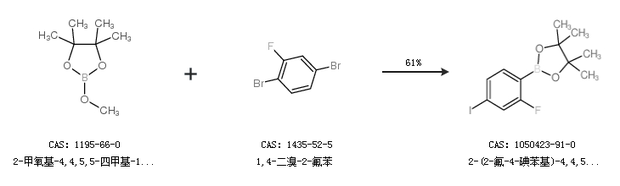 1.通过2-甲氧基-4,4,5,5-四甲基-1,3,2-二氧硼戊环和1,4-二溴-2-氟苯合成2-(2-氟-4-碘苯基)-4,4,5,5-四甲基-1,3,2-二噁硼烷,收率约61%;