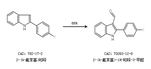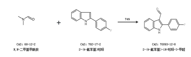 2.通过N,N-二甲基甲酰胺和2-(4-氟苯基)吲哚合成2-(4-氟苯基)-1H-吲哚-3-甲醛,收率约74%;