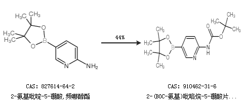 1.通过2-氨基吡啶-5-硼酸,频哪醇酯合成2-(BOC-氨基)吡咯烷-5-硼酸片呐醇酯,收率约44%;