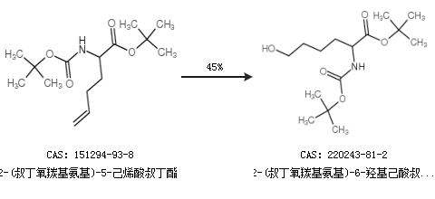 1.通过2-(叔丁氧羰基氨基)-5-己烯酸叔丁酯合成2-(叔丁氧羰基氨基)-6-羟基己酸叔丁酯,收率约45%;