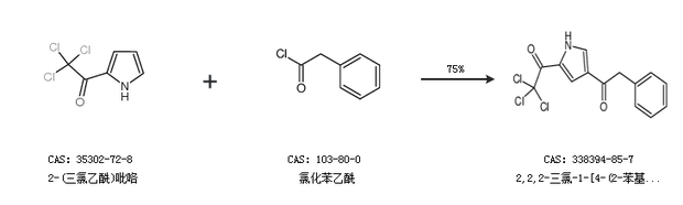 1.通过2-(三氯乙酰)吡咯和氯化苯乙酰合成2,2,2-三氯-1-[4-(2-苯基乙酰基)-1H-吡咯-2-基]-1-乙酮,收率约75%;