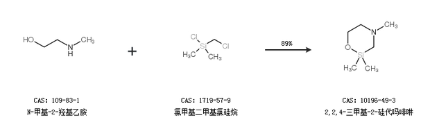 1.通过N-甲基-2-羟基乙胺和氯甲基二甲基氯硅烷合成2,2,4-三甲基-2-硅代吗啡啉,收率约89%;