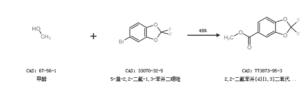 1.通过甲醇和5-溴-2,2-二氟-1,3-苯并二噁唑合成2,2-二氟苯并[d][1,3]二氧代-5-羧酸甲酯,收率约49%;