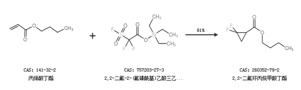1.通过丙烯酸丁酯和2,2-二氟-2-(氟磺酰基)乙酸三乙基硅酯合成2,2-二氟环丙烷甲酸丁酯,收率约81%;