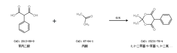 2.通过苯丙二酸和丙酮合成2,2-二甲基-5-苯基-1,3-二氧杂环乙烷-4,6-二酮,收率约61%;