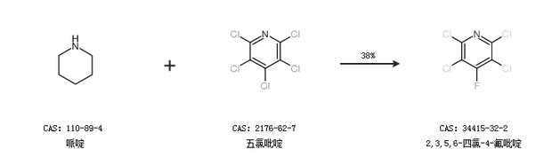 2.通过哌啶和五氯吡啶合成2,3,5,6-四氯-4-氟吡啶,收率约38%;