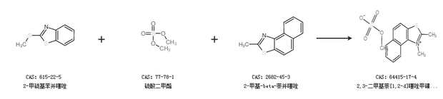 2.通过2-甲硫基苯并噻唑、硫酸二甲酯和2-甲基-beta-萘并噻唑合成2,3-二甲基萘[1,2-d]噻唑甲磺酸盐