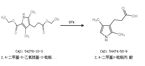 1.通过2,4-二甲基-5-乙氧羰基-3-吡咯丙酸乙酯合成2,4-二甲基3-吡咯丙 酸,收率约97%;