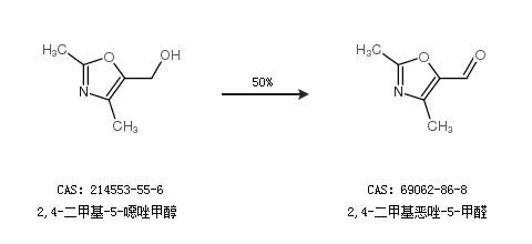 1.通过2,4-二甲基-5-噁唑甲醇合成2,4-二甲基恶唑-5-甲醛,收率约50%;