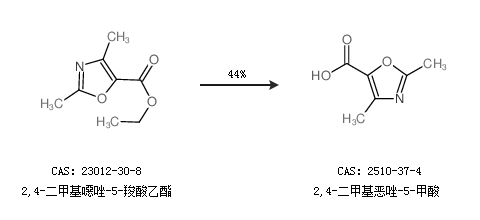 1.通过2,4-二甲基噁唑-5-羧酸乙酯合成2,4-二甲基恶唑-5-甲酸,收率约44%;