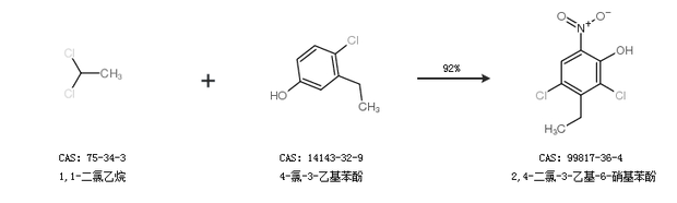 1.通过1,1-二氯乙烷和4-氯-3-乙基苯酚合成2,4-二氯-3-乙基-6-硝基苯酚,收率约92%;