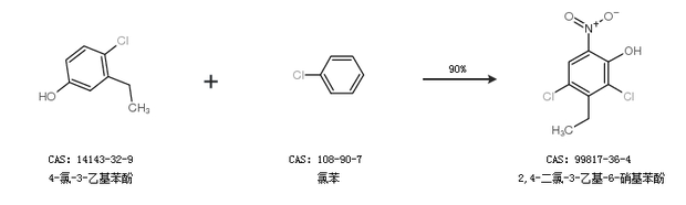 2.通过4-氯-3-乙基苯酚和氯苯合成2,4-二氯-3-乙基-6-硝基苯酚,收率约90%;