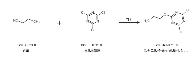 1.通过丙醇和三氯三聚氰合成2,4-二氯-6-正-丙氧基-1,3,5-三嗪,收率约75%;