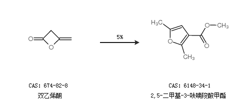 2.通过双乙烯酮合成2,5-二甲基-3-呋喃羧酸甲酯,收率约5%;